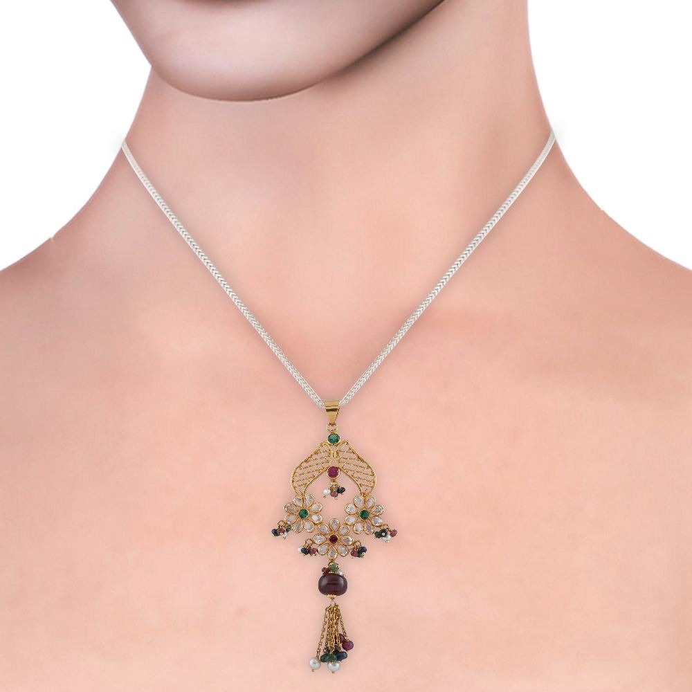HomeAll JewelleriesGold Glossy Filigree CZ Floral With Multicolour Beads Gold Pendant Set – FPS236